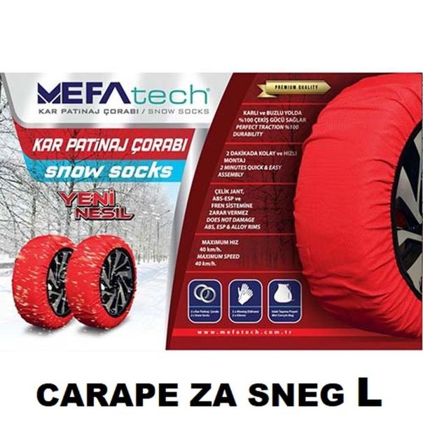 Mefa tech auto čarape za sneg i led. Zamena za auto lance. Dozvoljeno po zakonu. Jednostavno postavljanje za 2 minuta. čarape se postavljaju na pogonske točkove. Postaviti čarapu na vrh točka i navlačiti je na dole sve dok je to moguće. Malo pomeriti auto napred ili nazad da bi navukli čarapu na ceo točak. Ukoliko put nije prekriven snegom preporučujemo da ne koristite čarape za sneg i led. Nakon korišćenja preporučujemo da ručno obrišete i osušite čarape pre nego sto ih vratite u pakovanje. brzina kretanja vozila sa čarapama ne sme biti veca od 50 km-H. Nagla kočenja i ubrzanja mogu oštetiti čarape. Kada je vozilo parkirano, čarape se moraju ukloniti sa točkova zbog rizika od smrzavanja pri niskim temperaturama.
