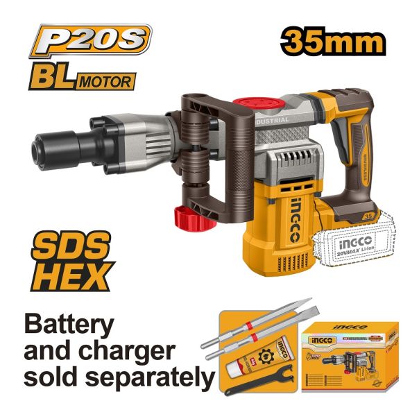 Koristi SDS HEX sistem stezne glave od 17 mm, koji garantuje sigurnu vezu sa dletom i maksimalan prenos snage u teškim primenama. Uređaj je deo P20S platforme, što znači da koristi univerzalne INGCO 20V litijum-jonske baterije.