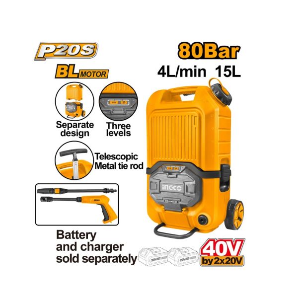 CPWLI4006 Akumulatorski perač pod pritiskom 15L SOLO INGCO Opis proizvoda: Namenjen je za pranje hladnom vodom pod visokim pritiskom, koji se može koristiti za pranje automobila, dvorišta, terase, tepiha, raznih vrsta podova i slično Ingco akumulatorski perač nudi 2 režima napajanja vodom i iz integrisanog rezervoara ali i direktno iz vodovodne mreže kao kod klasičnih električnih perača. Tehničke karakteristike proizvoda: Motor bez četkica Napon: 40V Maksimalni pritisak: 80 bara. Protok: 4L/min Tri nivoa Automatski sistem zaustavljanja Teleskopski metalni nosač Skladištenje u dvorištu Kontrolna tabla na dodir Rezervoar od 15 litara Težina: 5,8 kg. Obim isporuke proizvoda: CPWLI4006 Akumulatorski perač pod pritiskom 15L SOLO INGCO Igla za čišćenje mlaznice 5 m PVC crevo pod pritiskom Ulazni adapter Pištolj za prskanje Uputstvo za upotrebu proizvoda Kartonsko pakovanje Isporučuje se bez baterije i punjača