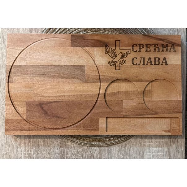 Unikatna ručno rađena slavska daska od prirodnog drveta, namenjena za posluženje slavskog kolača, vina i kadionicom. Na dasci je laserom graviran golub i krst, simboli mira i blagoslova, uz natpis „Srećna slava”.