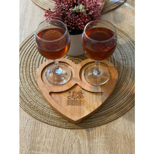 Drvena daska za serviranje u obliku srca, sa dve okrugle pregrade – savršene za dve šoljice kafe, ili šoljicu i kolačić. Idealna za romantično posluženje u dvoje ili za elegantan duet kafe i poslastice.