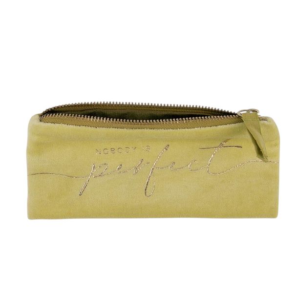 Somotna pernica u žutoj boji predstavlja savršen spoj stila i funkcionalnosti za sve koji traže elegantno mesto za svoje najvažnije sitnice. Baršunasta tkanina je izuzetno mekana na dodir i daje pernici luksuzan izgled, dok rajsferšlus obezbeđuje sigurno čuvanje i lak pristup sadržaju. Poseban akcenat je natpis „Nobody is perfect“ u žutoj boji – poruka koja nas podseća da savršenstvo ne postoji i da su greške deo naše autentičnosti. Ova pernica nije samo praktičan dodatak, već i pravi modni statement.