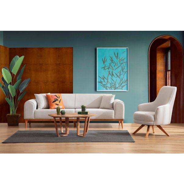 ATELIER DEL SOFA Trosed Kapri u krem boji predstavlja savršen spoj elegancije i funkcionalnosti. Njegov ram je izrađen od bukovog drveta i oplemenjene iverice, što garantuje dugotrajnost i stabilnost. Presvlaka od 100% poliestera ne samo da pruža prijatan osećaj na dodir, već je i pogodna za hemijsko čišćenje, što olakšava održavanje.