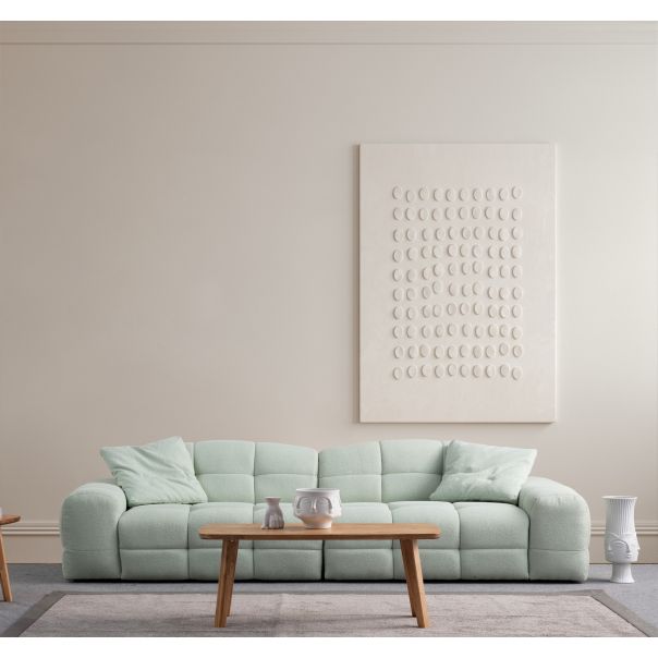 Sedište je ispunjeno sivom penom 28 DNS soft i 24 DNS mekom penom, pružajući optimalnu udobnost i podršku. Naslon je kombinacija 60% usitnjene pene i 40% silikonske pene, što omogućava savršeno prilagođavanje obliku vašeg tela. Trosed dolazi sa tri jastuka, dodatno povećavajući udobnost.