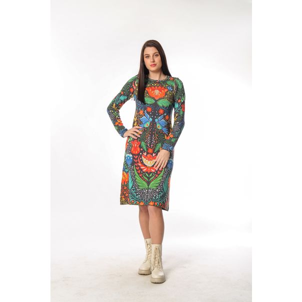 Predstavljamo vam jedno remek delo u formi štrikane haljine, "Crni Eden". Ova haljina će vas očarati svojim dezenom i pažljivo razrađienim motivima. Ključne karakteristike: 1. Premium trikotaža: Spoljašnja strana je izrađena od prirodne viskoze 68%, akril 29%, elastan 3% osiguravajući mekan i prirodan opip. Unutrašnja strana kombinuje toplinu i mek dodir akrila (50%) sa prozračnom udobnošću pamuka (50%), čineći ovu haljinu savršenim spojem udobnosti i funkcionalnosti. 2. Savršen za svaku priliku: Bilo da prisustvujete šarmantnom događaju ili jednostavno želite da popijete kafu sa prijateljicom, haljina "Crni Eden" je savršen izbor.