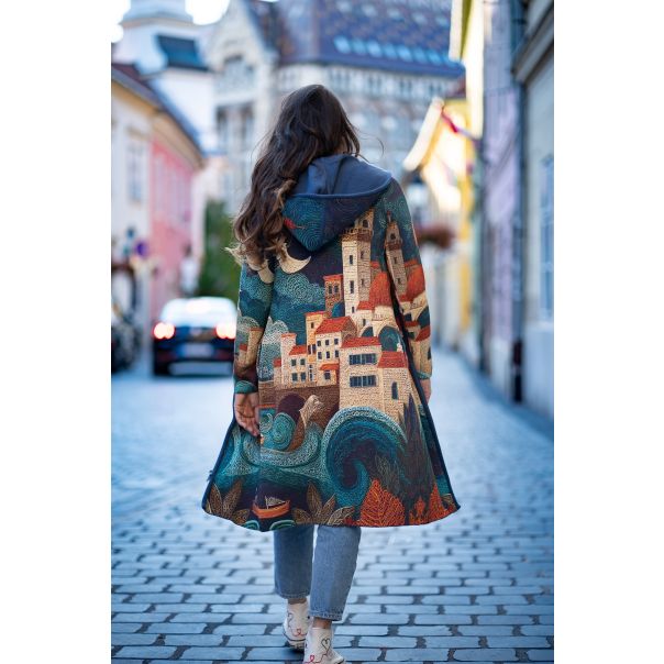 „Jadran“ je štrikani (pleteni) ženski kaput koji priziva miris mora, talase i mediteranske krovove. Bogate tirkizno–morske nijanse, motivi obale i kućica čine ga upečatljivim komadom za svaku priliku. Lak za kombinovanje uz farmerke, haljine i čizme, dostupan je u varijanti sa kapuljačom.