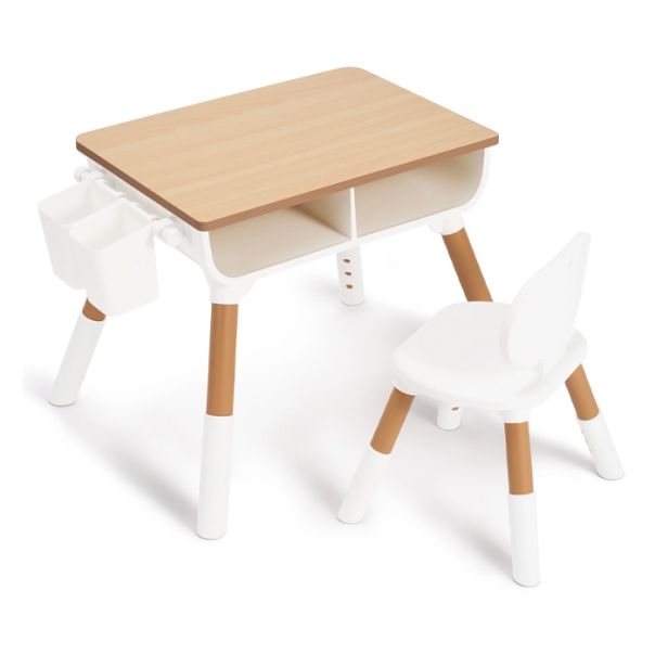 Nogare stola i stolica su podesive, što omogućava prilagođavanje visini deteta. Ova funkcionalnost osigurava da set raste zajedno sa vašim detetom, pružajući mu optimalnu udobnost tokom korišćenja.