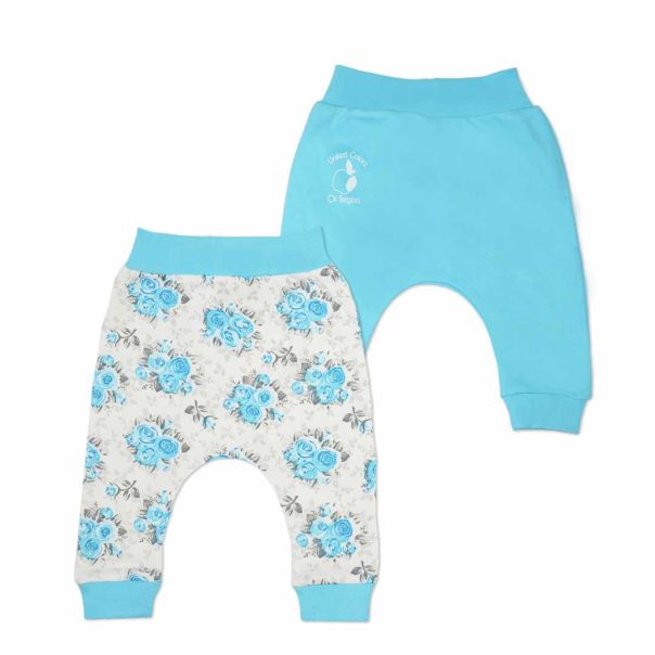 Set od dva donja dela bez stopica sa elastičnim pojasom. Jedan sa cvetnim dezenom celom površinom i drugi jednobojan.