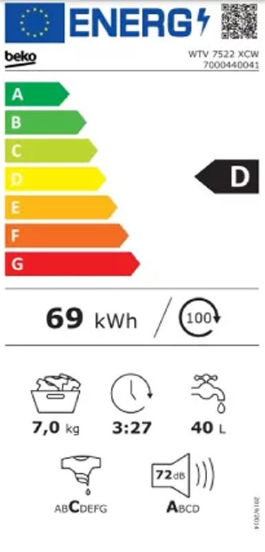 BEKO WTV 7522 XCW troši 40 litara vode po ciklusu i 69 kWh kroz 100 ciklusa. Nivo buke iznosi 72 dB, što je prihvatljivo za kućnu upotrebu. Dimenzije mašine su 60 x 84 x 49 cm, a njena neto masa je 64 kg.