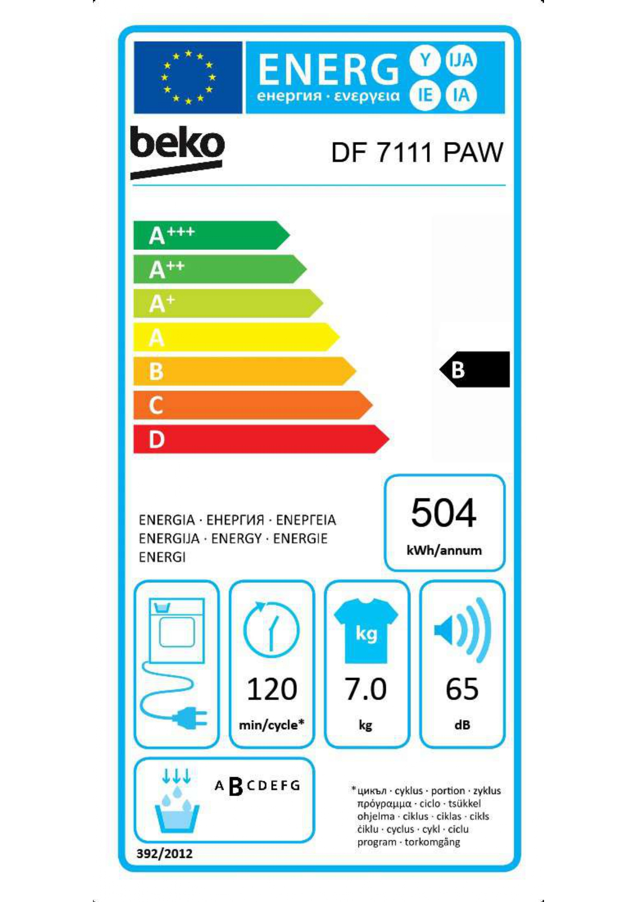 Karakteristike Tip Mašina za sušenje veša Tip mašine Kondezaciona Kapacitet 7kg Energetska klasa B detaljnije objašnjenje o novim energetskim klasama pogledajte na linku Broj programa