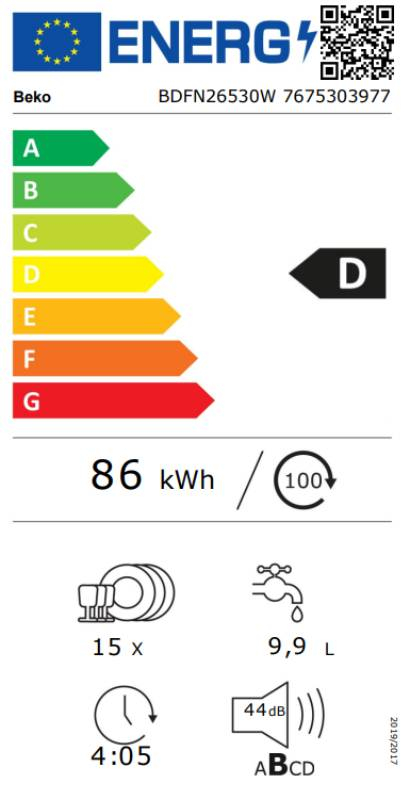 Sa nivoom buke od samo 44 dB, BEKO BDFN 26530 W omogućava tihi rad, što je pogodno za korišćenje u večernjim satima bez ometanja kućne atmosfere. Energetski razred D i potrošnja električne energije od 86 kWh kroz 100 ciklusa čine je ekonomičnim izborom za svakodnevnu upotrebu.