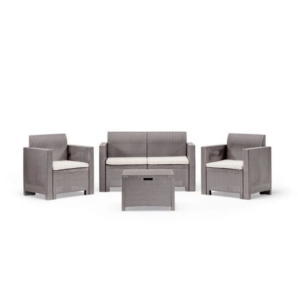 Set sadrži dve fotelje sa visokim i ergonomskim naslonom, jedan dvosed i stočić sa prostorom za odlaganje. Uz to, dolazi sa četiri jastuka za dodatnu udobnost, omogućavajući vam da se potpuno opustite i uživate u svom spoljašnjem prostoru.