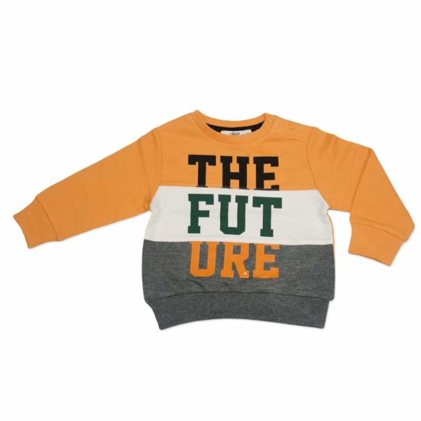 Bluza sa dugim rukavima, okruglim izrezom i kopčanje dugmićima na ramenu. Rebrasti elastični rubovi i tekstualni slogan sa prednje strane.
