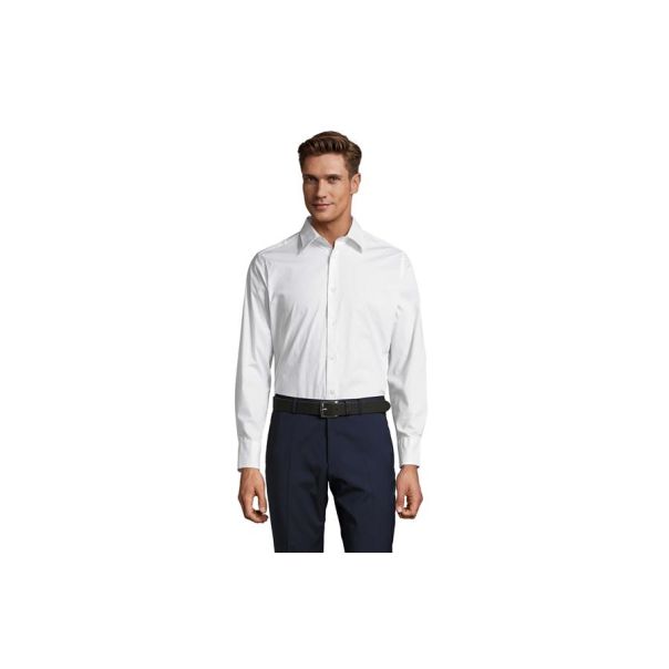 SOL'S BRIGHTON je muška košulja dugih rukava modernog i trendi stila. Izrađena od POPLIN STRETCH materijala od 140 g/m² (97% pamuk i 3% elastin), pruža udobnost i slobodu pokreta zahvaljujući elastičnom i rastegljivom sastavu. Kroj koji prati liniju tela naglašava uredan i elegantan izgled, dok detalji poput polu-otvorene kragne i manžetni sa podešavanjem doprinose praktičnosti. Idealan izbor za poslovne prilike, timove i uniforme.