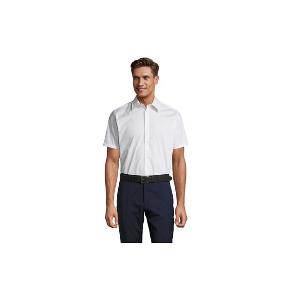 SOL'S BROADWAY je muška košulja kratkih rukava modernog i trendi dizajna. Izrađena od POPLIN STRETCH materijala od 140 g/m² (97% pamuk i 3% elastin), pruža maksimalnu udobnost i slobodu pokreta zahvaljujući elastičnom sastavu. Kroj koji prati liniju tela osigurava elegantan i uredan izgled, dok polu-otvorena kragna sa jednim dugmetom i sedam dugmadi u boji košulje daju završni stilski pečat. Savršena je za poslovne prilike, uniforme i promotivne aktivnosti tokom toplijih dana.