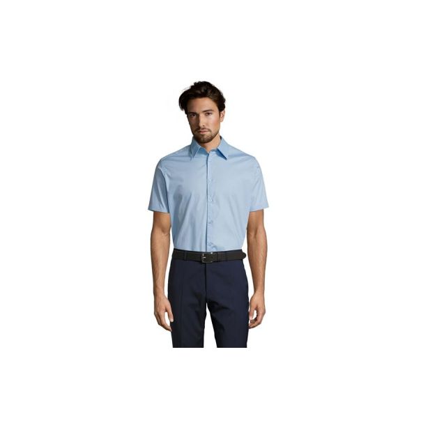 SOL'S BROADWAY je muška košulja kratkih rukava modernog i trendi dizajna. Izrađena od POPLIN STRETCH materijala od 140 g/m² (97% pamuk i 3% elastin), pruža maksimalnu udobnost i slobodu pokreta zahvaljujući elastičnom sastavu. Kroj koji prati liniju tela osigurava elegantan i uredan izgled, dok polu-otvorena kragna sa jednim dugmetom i sedam dugmadi u boji košulje daju završni stilski pečat. Savršena je za poslovne prilike, uniforme i promotivne aktivnosti tokom toplijih dana.