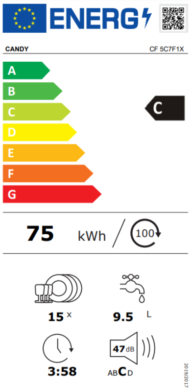 Energetski razred C i potrošnja vode od samo 9.5 litara po ciklusu čine ovu sudomašinu ekonomičnim izborom. Potrošnja električne energije iznosi 75 kWh kroz 100 ciklusa, dok nivo buke od 47 dB osigurava tihi rad.