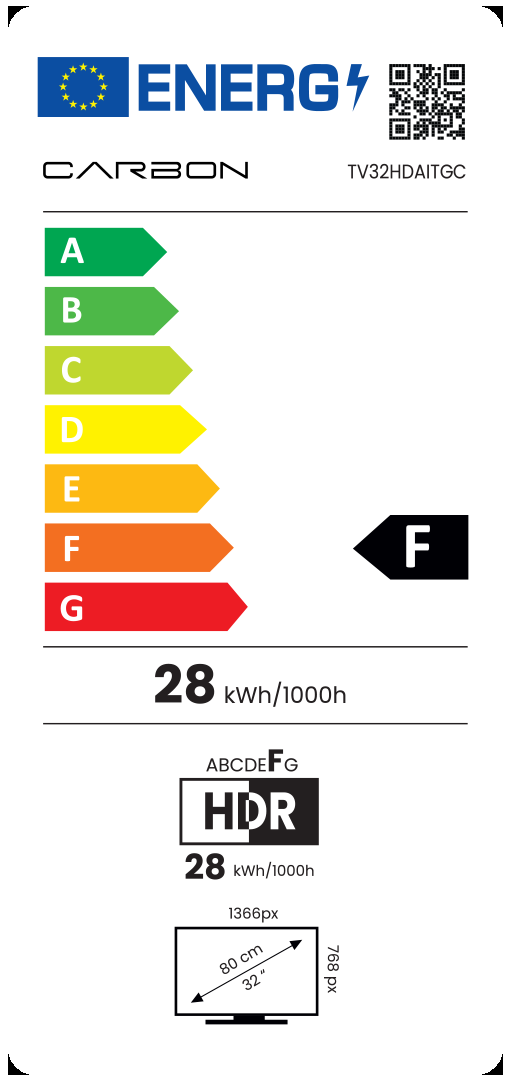CARBON Televizor TV32HDAITGC dolazi sa ekranom dijagonale 32 inča (81,3 cm), pružajući HD Ready rezoluciju od 1366 × 768 piksela. Zahvaljujući Direct LED osvetljenju, slika je jasna i živopisna, dok brzina osvežavanja od 60 Hz i vreme odziva od 8 ms omogućavaju glatko prikazivanje sadržaja. Odnos stranica od 16:9 i široki ugao gledanja od 178° u svim pravcima garantuju odličan vizuelni doživljaj iz bilo kog ugla.
