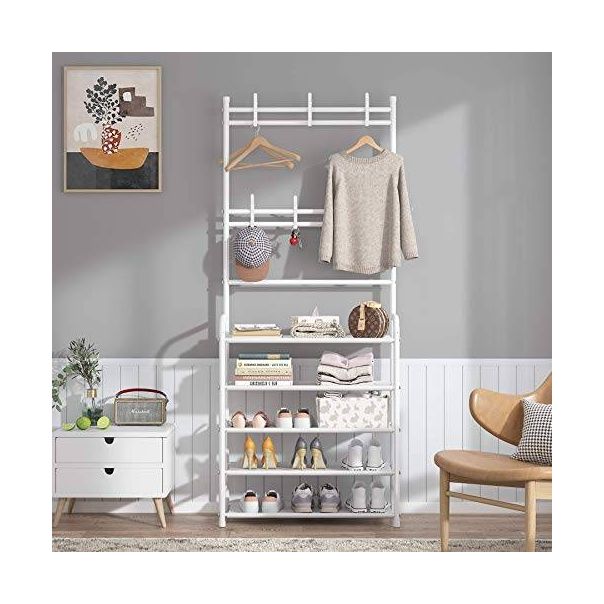 Multifunkcionalni dizajn: Vrlo modernim, funkcionalnim, jednostavnim dizajnom i stilom, ovaj elegantni stalak za kapute učiniće da naš hodnik, kupatilo, ulaz, ili balkon bude organizovaniji i moderniji. Dizajn 3 u 1, stalak za kapute, stalak za cipele i 8 kuka su kombiani da zadovolje sve naše potrebe za skladištenjem bez zauzimanja prostora. Ovaj stalak za kapute i obuću nam nudi udoban život sa urednim okruženjem našeg doma, bez bespotrebnog nereda