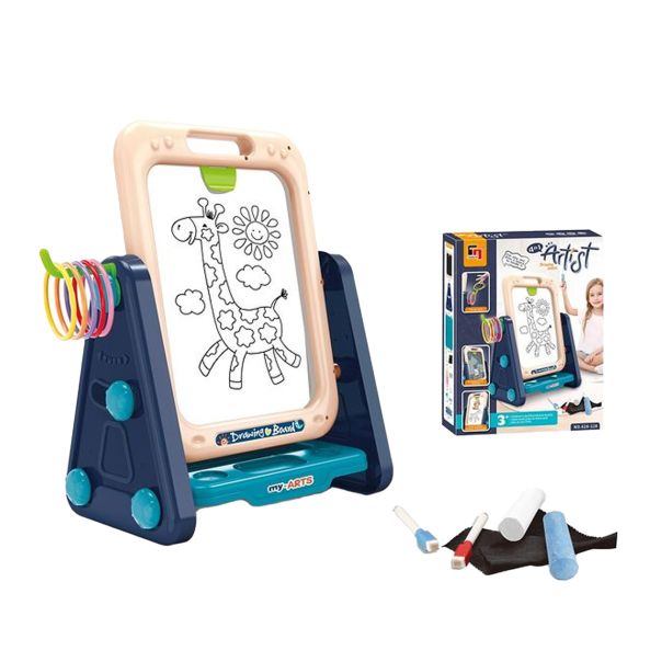 Druga strana table je namenjena za pisanje kredom. Odeljak za pisanje kredom dolazi sa klipom na koji se mogu zakačiti šabloni, omogućavajući deci da prate oblike i razvijaju svoje veštine crtanja.