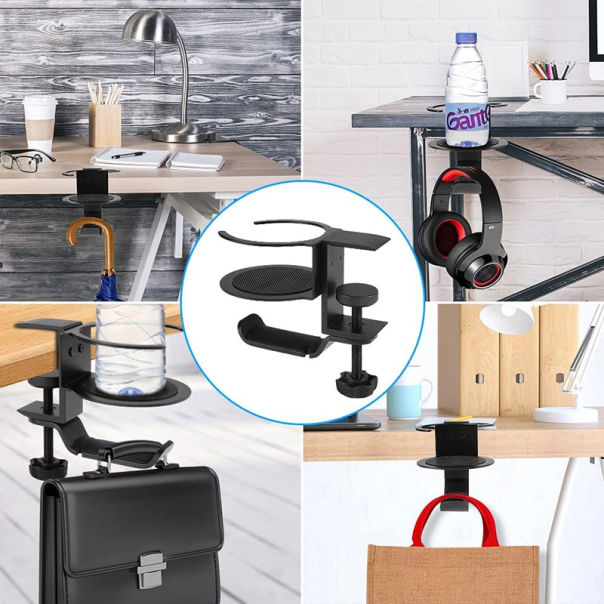 Izdržljiv i stilski – Napravljen od visokokvalitetnog aluminijuma, držač za slušalice je izuzetno izdržljiv i dovoljno jak da drži PC gejmerske slušalice i flašu vode, bez savijanja ili loma. Maksimalna nosivost držača za slušalice je 5 kg. Sa jednostavnim linijama, glatkom površinom i modernim izgledom, takođe može lepo ukrasiti vaš radni sto. Podesivi stalak za slušalice – Dizajniran sa podesivim zavrtnjem, držač za slušalice može se pričvrstiti na većinu stolova debljine od 5 mm do 50 mm. 360° rotirajuća ruka omogućava svestranost u skladištenju vaših težih slušalica i može se orijentisati unutra, spolja, levo i desno u zavisnosti od vaših ličnih navika. Višenamenski držač za slušalice – Dizajniran sa dodatnim držačem za čašu i dve petlje za organizaciju kablova. Ovaj držač ne samo da čuva vaše slušalice, već i omogućava postavljanje čaše i održavanje kablova od slušalica urednim i podalje od poda. Održava vaš sto čistim. Meka silikonska podloga – Krajevi stezaljke opremljeni su mekanim silikonskim jastučićima koji sprečavaju ogrebotine na bilo kojoj montiranoj površini kao što su drvo, staklo i metal. Podmetač koristi zrnasti silikonski gel koji sprečava pomeranje čaše. Dizajn bez bušenja – Nema potrebe za lepljenjem, neredima ili bušenjem, držač za slušalice je lak za instalaciju i uklanjanje. Brza instalacija za nekoliko minuta bez oštećenja.