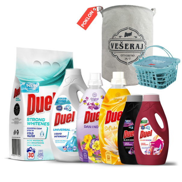 Duel Praškasti deterdžent Strong Whiteness 2.7kg Duel Praškasti deterdžent Strong Whiteness 2.7kg je savršen izbor za dubinsko čišćenje i očuvanje besprekorne beline vaše odeće. Ovaj inovativni i efikasni deterdžent pruža izvanredne performanse u pranju, uklanjanju mrlja i osvežavanju tkanina. Pogodan za mašinsko i ručno pranje, Duel Strong Whiteness je idealan za svakodnevnu negu bele odeće. Efikasno čišćenje i izbeljivanje Duel Strong Whiteness praškasti deterdžent je obogaćen sredstvom za izbeljivanje na bazi kiseonika koje garantuje bolje rezultate izbeljivanja.Efikasno uklanjaja mrlje i prljavštinu. Ovaj deterdžent je idealan za sve vrste bele odeće i pruža vrhunske rezultate čak i na nižim temperaturama, već od 30°C. Univerzalna primena i prijatan miris Duel deterdžent ostavlja prijatan i dugotrajan miris na odeći. Karakteristike Efikasno uklanjanje mrlja i očuvanje intenzivne beline Obogaćen sredstvom za izbeljivanje na bazi kiseonika Formula sa enzimima za dubinsko enzimsko pranje Pogodan za mašinsko i ručno pranje Efikasno pranje na niskim temperaturama, već od 30°C Prijatan i dugotrajan miris Duel Universal tečni gel 2.45l Univerzalna formula za besprekorno čistoću Duel Tečni deterdžent Universal od 2.45l pruža snažnu formulu koja efikasno uklanja prljavštinu sa svih vrsta tkanina. Idealan za svakodnevno pranje. Prikladan za sve temperature, Duel Universal osigurava rezultate koji zadovoljavaju najviše standarde čistoće. Njegova formula je blaga prema tkaninama, čuvajući njihovu mekoću i postojanost boja. Sa ovim deterdžentom, vaš veš će biti ne samo čist, već i prijatan na dodir, sa mirisom koji osvaja. Ekonomično pakovanje za veću praktičnost Pakovanje od 2.45l Duel Universal deterdženta predstavlja ekonomičan izbor za domaćinstva koja traže kvalitetno i dugotrajno rešenje za pranje veša. Sa svakim pranjem, ovaj deterdžent pruža maksimalan učinak i optimalnu svežinu, čineći vašu rutinu pranja efikasnijom i praktičnijom. DUEL Tečni deterdžent COLOR RENEW 855 ml Otkrijte moć DUEL Color Renew deterdženta, specijalno dizajniranog da osveži boje i produži vek vaše omiljene obojene odeće! Zahvaljujući inovativnoj Color Renew komponenti, ovaj deterdžent obnavlja sjaj i intenzitet boja istovremeno štiteći tkaninu od oštećenja.Vraća originalni sjaj i intenzitet boja, čak i kod odeće koja je često prana. Zaštita od gubitka boje: Specijalna formula smanjuje ispiranje boja, čuvajući njihov svež izgled nakon svakog pranja Nega tkanine: Blaga formula štiti vlakna tkanine, održavajući ih glatkima i otpornima na habanje Univerzalna upotreba: Idealan za sve vrste obojenih tkanina, od pamučnih do sintetičkih, u svim temperaturama pranja Dugotrajan miris: Pruža osvežavajući miris koji ostaje postojan dugo nakon pranja Sa Color Renew deterdžentom, vaša obojena odeća izgleda kao nova, sa živopisnim bojama koje traju. Duel tečni deterdžent Black & Jeans 855ml Ovaj specijalno formulisan tečni deterdžent za tamni obojeni veš i džins je pravi izbor za sve koji žele da očuvaju duboke i intenzivne tonove svoje omiljene odeće. Duel Black & Jeans pruža savršenu zaštitu boje i tkanine. Duel tečni deterdžent je savršen za tamnu odeću, posebno za džins, jer štiti boje i teksturu materijala. Formula je blaga, ali efikasna, štiteći vlakna tkanine i sprečavajući oštećenja i habanje, čak i nakon višestrukih pranja. Pored toga, ovaj deterdžent je efikasan na svim temperaturama pranja, bilo da koristite hladnu ili toplu vodu.Ovaj tečni deterdžent ne samo da efikasno pere vašu odeću, već ostavlja i dugotrajan, prijatan miris. Bilo da perete crne, tamnoplave, sive ili džins komade, Duel Black & Jeans će osvežiti vašu odeću, ostavljajući je savršeno čistu i sa mirisom koji traje. Savršen je za sve koji žele da očuvaju kvalitet i izgled svog tamnog veša i džinsa, pružajući dugotrajan efekat čišćenja i osvežavanja. Karakteristike Zaštita boje: Održava duboke tonove crne, tamnoplave, sive i drugih tamnih boja Nega tkanine: Štiti vlakna tkanine, sprečavajući oštećenja i habanje Idealno za džins: Posebno pogodan za džins materijale Efikasan na svim temperaturama pranja: Može se koristiti u hladnoj i toploj vodi Prijatan miris: Ostavlja dugotrajan, osvežavajući miris Pakovanje: 855 ml Duel Soft Lotus 1,6l Na tržištu kojim dominiraju plavi i omekšivači klasičnih mirisa, DUEL je postigao najveću prodaju sa žutim omekšivačem inspirisanim Orijentom. Reč je o izuzetno popularnoj noti mirisa Soft Lotus. Savršena kombinacija mirisa božura i plemenitog mošusa čini da veš odiše elegancijom i svežinom. U svom sastavu sadrži silikon, funkcionalni dodatak, koji doprinosi boljoj mekoći tkanine, olakšava peglanje, daje punoću i bogat osećaj na dodir. DUEL omekšivač Soft Lotus pruža vašoj odeći izuzetnu mekoću i negu.Miris Olfaktorni opis Anise star Bergamot Rose Peony Rose the Water flowers Musk Peach Rose Karakteristike Silikon: Doprinosi boljoj mekoći tkanine, olakšava peglanje, daje punoću i bogat osećaj na dodir Popularna mirisna nota: Soft Lotus inspirisan Orijentom Elegancija i svežina: Kombinacija mirisa božura i plemenitog mošusa Zemlja porekla: Srbija Duel Omekšivač – DAN I NOĆ ✔