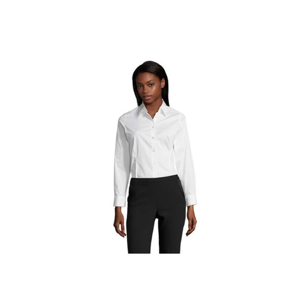 SOL'S EDEN je ženska košulja dugih rukava modernog i ženstvenog kroja. Izrađena od POPLIN STRETCH materijala od 140 g/m² (97% pamuk i 3% elastin), pruža udobnost i slobodu pokreta zahvaljujući elastičnom i rastegljivom sastavu. Kroj koji prati liniju tela naglašava eleganciju, dok detalji poput kragne sa jednim dugmetom i manžetni sa mogućnošću podešavanja doprinose praktičnosti i sofisticiranom izgledu. Savršen izbor za poslovne prilike, timove i uniforme.
