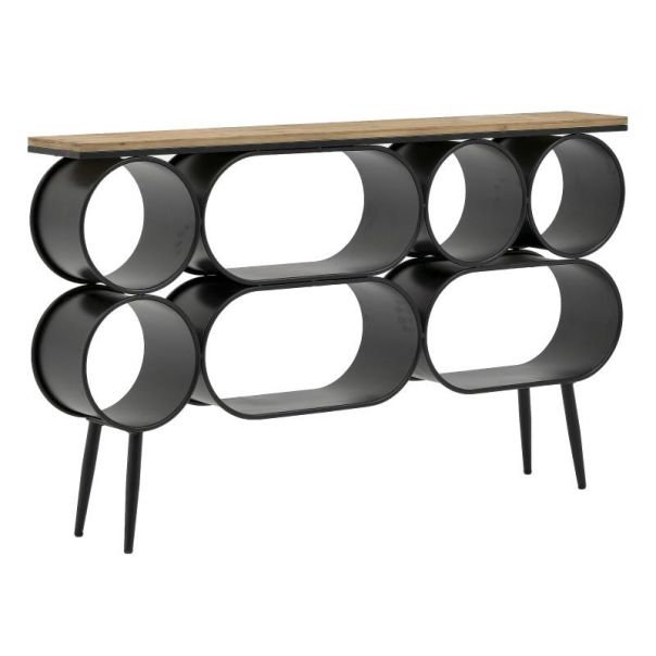 Konzola je izrađena od kombinacije drveta i metala što joj daje elegantan i moderan izgled. U svom zanimljivom obliku, ova konzola daće poseban dekorativan akcenat vašem domu. Sedam otvora koji se nalaze ispod police, možete dekorisati i ukrasiti cvećem i dekorativnim predmetima. Ovu konzolu možete ukombinovati sa policom koja je iz iste kolekcije. Dimenzije: 160x25x97 cm