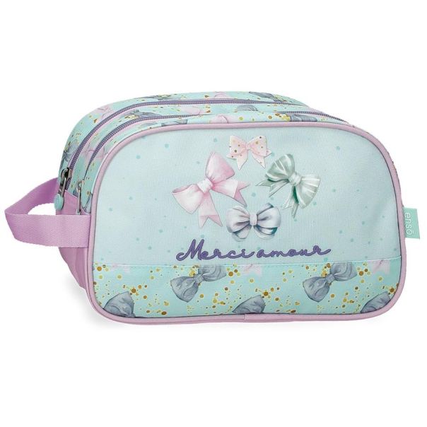 Enso MERCI AMOUR dečiji neseser sa 2 pregrade dizajniran je za devojčice koje vole pastelne boje, mašnice i romantične detalje. Nežna kombinacija mint i puder-ružičaste boje, uz dekorativne mašnice i natpis Merci amour, daje neseseru elegantan i bajkovit izgled. Idealan je za svakodnevnu upotrebu, vrtić, putovanja i slobodne aktivnosti.