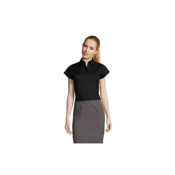 SOL'S EXCESS je ženska košulja kratkih rukava koja kombinuje moderan stil i praktičnost. Izrađena od POPLIN STRETCH materijala od 140 g/m² (97% pamuk i 3% elastin), pruža udobnost i slobodu pokreta zahvaljujući elastičnom sastavu. Trendy & feminine kroj koji prati liniju tela naglašava eleganciju, dok polu-otvorena kragna sa jednim dugmetom daje sofisticiran i uredan izgled. Idealna je za poslovne prilike, uniforme i promotivne aktivnosti tokom toplijih dana.