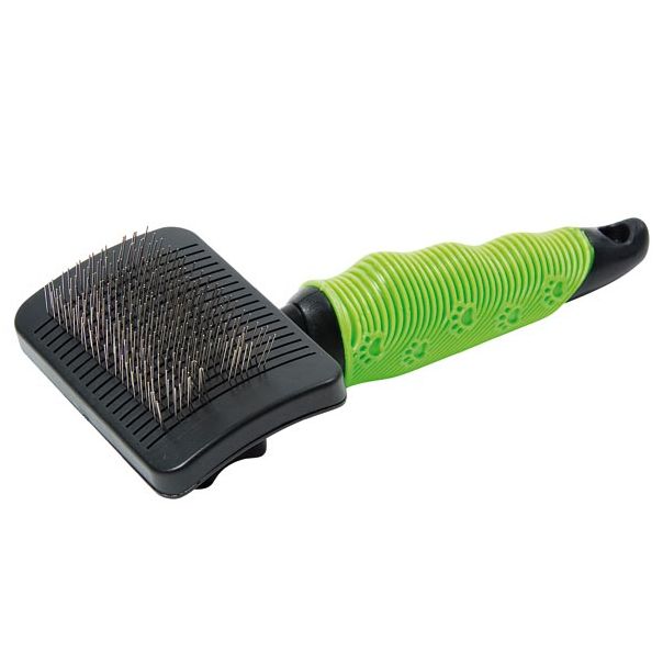 Četka za pse i mačke, sa tankim zakrivljenim zupcima, na dugme na dršci zubci se povuku i tako se lako odstranjuje dlaka koja se skupi češljanjem ljubimca na samoj četki.