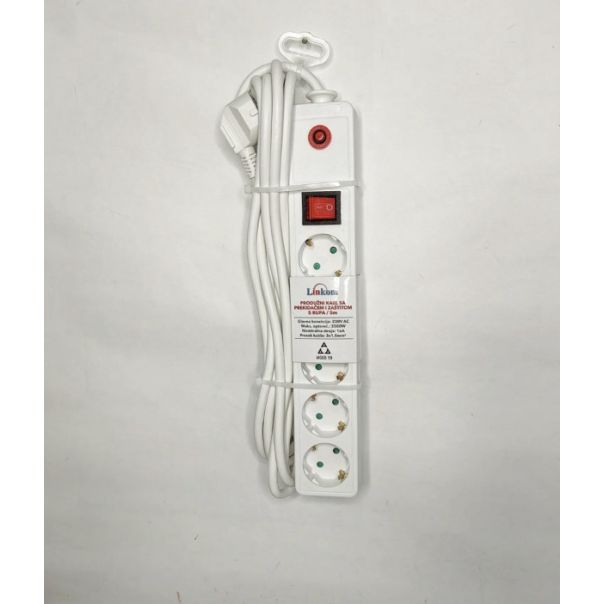 Kvalitetan naponski produžni kabl sa prekidačem i zaštitom, 5 utičnica, dužina 5m, za struju do 16A, napon 230V~ i snagu do 3500W, Presek kabla: 3 X 1.5mm2, bele boje. Produžni kabl dolazi u pvc foliji sa kukicom za kačenje.