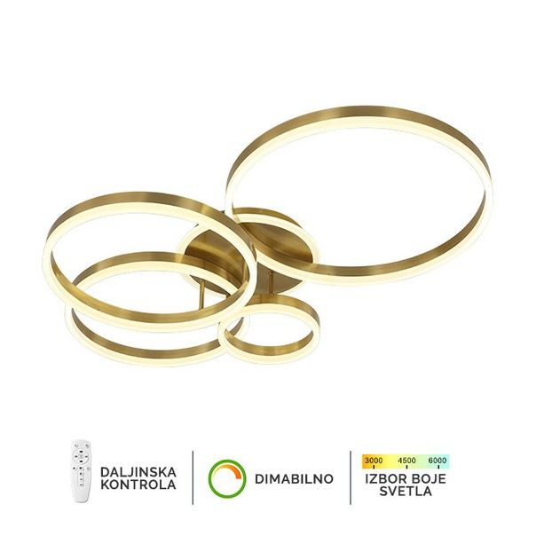 LED plafonska lampa Forma F2047-132C SG koja dolazi u boji zlata, doprinosi modernom izgledu vaših prostorija. Jačina od 132W sa integrisanim LED svetlom omogućiće vam dugotrajno i elegantno osvetljenje.Takođe poseduje daljinski upravljač za odabir boje svetla u rasponu od 3000K do 6400K kao i dimovaje,sto omogućava da podesite jačinu svetla vašim potrebama.Zbog svojih dimenzija od Ø220xØ400xØ400xØ500mm ova lampa je idealna za osvetljenje trpezarije, spavaće ili dnevne sobe.