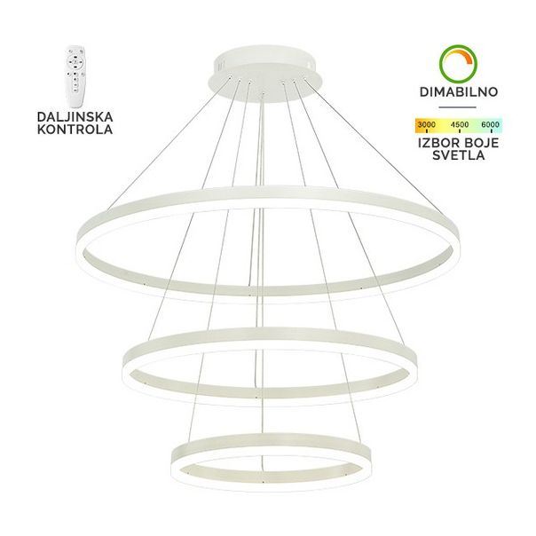 LED visilica Forma F2047-130V WH koja dolazi u beloj boji doprinosi modernom izgledu vaših prostorija.Jačina od 130W sa integrisanim LED svetlom omogućiče vam dugotrajno i elegantno osvetljenje.Takođe poseduje daljinski upravljač za odabir boje svetla u rasponu od 3000K do 6400K kao i dimovaje,sto omogućava da podesite jačinu svetla vašim potrebama.Zbog svojih dimenzija od 1200xØ400xØ600xØ800mm ova visilica je idealna za trpezarije, dnevne sobe, spavaće sobe.
