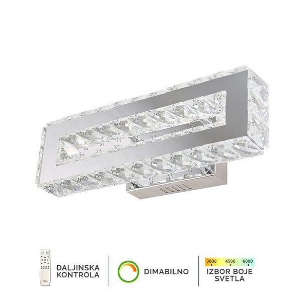 LED zidna lampa Forma KP6038-20Z oličava raskošnu eleganciju, sa impresivnim rasporedom kristalnih elemenata. Prozirni kristali i metalni držač savršeno se dopunjuju i daju svetlu elegantan, moderan izgled.Jačina od max.20W sa integrisanim LED svetlom omogućiče vam dugotrajno i elegantno osvetljenje.Takođe posedujedaljinski upravljač za odabir boje svetla u rasponu od 3000K do 6400K kao i dimovaje,sto omogućava da podesite jačinu svetla vašim potrebama.Zbog svojih dimenzija od 110x360x125mmm ova lampa je idealna za osvetljenje spavaće ili dnevne sobe.