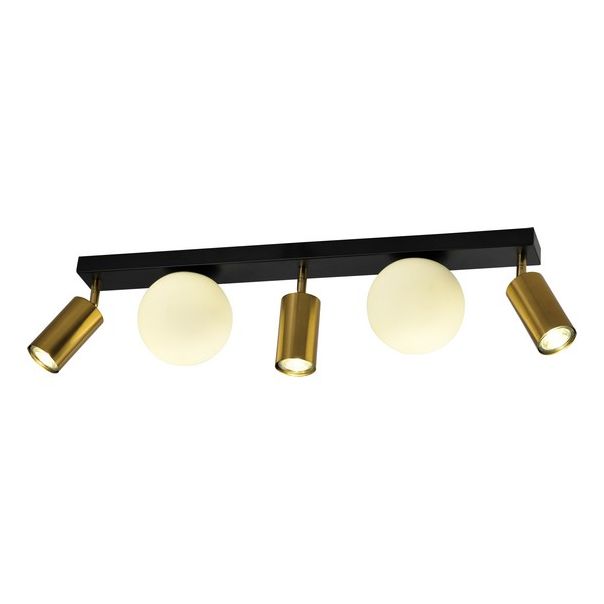 Spot lampa Forma FG155-5 BK+SG sa tri grla (GU10) i dva grla (E14) doprinosi modernom izgledu vaših prostorija.Izrađena je od metala u crnoj boji, grla su u boji zlata a kugle od stakla bele boje.Dizajn je modernog karaktera, sa elegantnim detaljima koji upotpunjuju njen luksuzni izgled.Zahvaljujući elegantnom horizontalnom obliku, bojama, originalnom i modernom dizajnu, može se uklopiti uz većinu enterijera.Zbog svojih dimenzija od 650x65mm ova lampa je idealna za trpezarije, dnevne sobe, spavaće sobe.