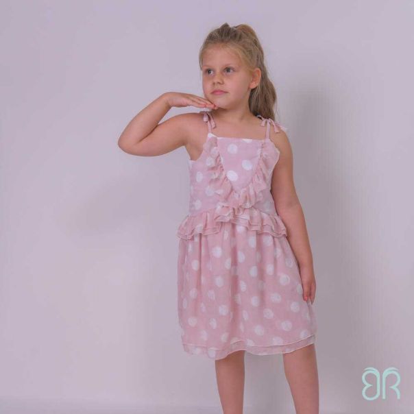 Haljina sa tankim bretelama na vezivanje, skrivenim rajsferslusom sa strane. Karneri na grudima, ispod grudi i na rubu. Dezen sa krupnim tufnama.