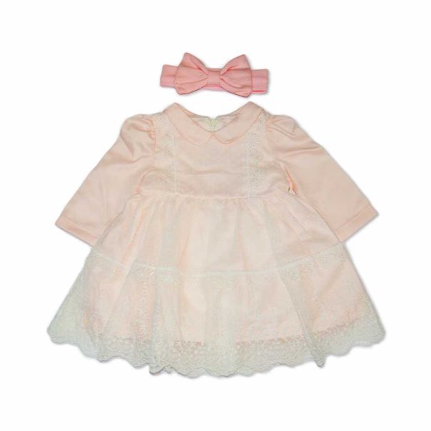 Haljina sa oblom kragnom, kopčanjem rajsferšlusom na vratu, dugim rukavima i izvezenim cvetnim motivom na tilu. Traka za kosu sa prišivenom mašnom.
