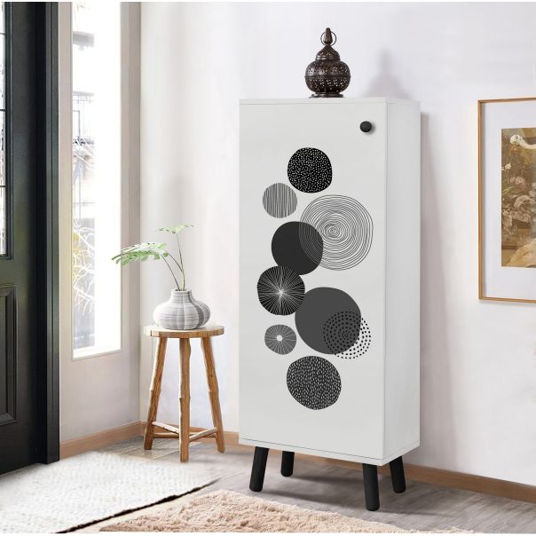 Cipelarnik je oblikovan sa nogarama i ručkama od punog drveta u crnoj boji, premazanim UV lakom za dodatnu zaštitu i sjaj. Prednja strana je ukrašena kružnim detaljima u crnoj i sivoj boji, što dodaje jedinstven vizuelni pečat.