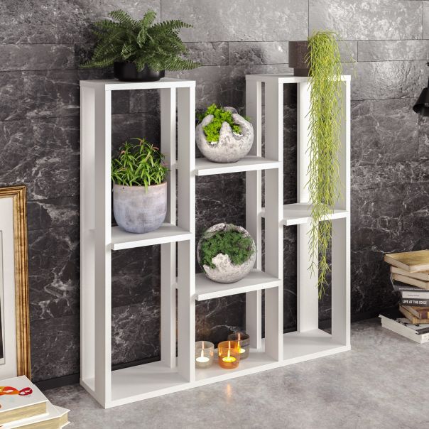 Polica Nevada nudi dovoljno prostora za različite namene. Veličina štanda za biljke iznosi 89,6 cm u širini, 93,2 cm u visini i 21,9 cm u dubini, pružajući dovoljno prostora za vaše omiljene zelene prijatelje. Srednja polica, sa širinom od 30,6 cm i visinom od 36 cm, idealna je za knjige, ukrase ili druge sitnice. Bočne police, dimenzija 25,8 cm u širini i 43,9 cm u visini, omogućavaju dodatnu organizaciju i izlaganje predmeta.