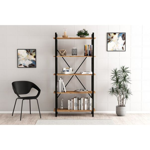 Struktura police je izrađena od crnog metala, što garantuje stabilnost i dugotrajnost. Metalni okvir pruža čvrstu osnovu, dok drvene police u boji oraha dodaju prirodan i sofisticiran izgled. Ova kombinacija materijala osigurava da polica izdrži težinu knjiga i dekorativnih predmeta, a da pritom zadrži svoj elegantan izgled.