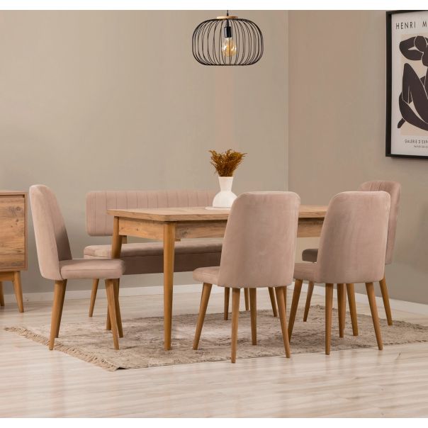 Dimenzije stola su 130x76x80 cm kada je zatvoren, dok se otvaranjem produžava na 165x76x80 cm, što omogućava dodatni prostor za goste. Stolice dimenzija 47x90x46 cm dolaze u setu od četiri komada, sa visinom sedišta od 49 cm, pružajući optimalnu udobnost. Banka dimenzija 110x82,5x47 cm sa visinom sedišta od 51 cm dodaje dodatni prostor za sedenje i savršeno se uklapa u celokupan dizajn.