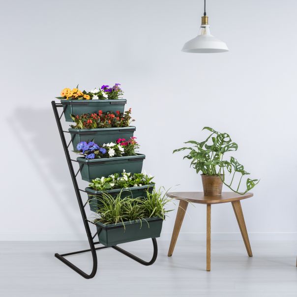 Stalak dolazi sa pet plastičnih saksija u tamnozelenoj boji, koje su savršene za različite vrste biljaka. Saksije su raspoređene na više nivoa, omogućavajući optimalno iskorišćenje prostora i bolju izloženost svetlosti. Sa nosivošću do 10 kg, stalak je dovoljno jak da podrži i teže biljke.