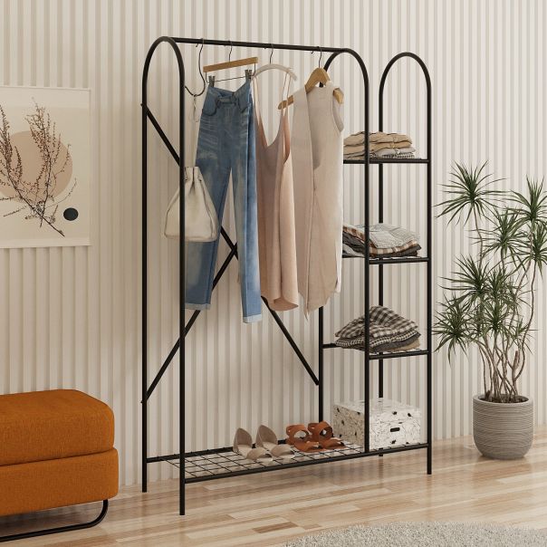 HANAH HOME Štender polica Peter nije samo funkcionalan, već i višenamenski. Možete ga koristiti u hodniku za kačenje kaputa i jakni, u spavaćoj sobi za organizaciju odeće, ili čak u kancelariji za odlaganje poslovne garderobe. Njegov minimalistički dizajn omogućava mu da se lako uklopi u različite stilove enterijera, od modernog do klasičnog.