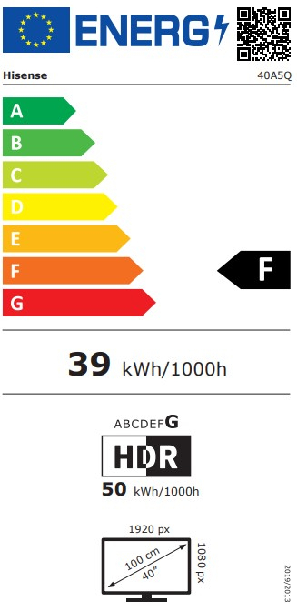 Sa energetskim razredom F za SDR i G za HDR, HISENSE 40A5Q je dizajniran da bude energetski efikasan. Potrošnja energije u StandBy režimu je samo 0.5 W, dok je maksimalna potrošnja u režimu rada 74 W. Dodatne funkcije uključuju roditeljsku kontrolu i PVR funkciju, zavisno od lokacije.