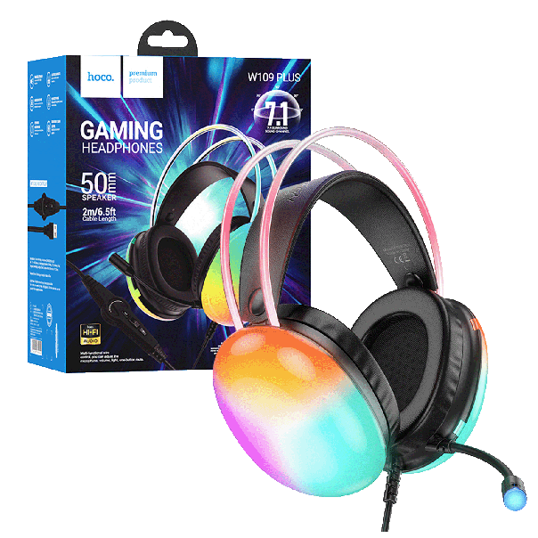 HOCO GAMING W109 Plus slušaliceSavršen dodatak za virtuelne igre. Imaju zvučne efekte, 7.1 zvuk, mikrofon i LED rasvetuKomplet sa ugrađenim omnidirekcionim mikrofonom i velikim, udobnim štitnicima za uši sa LED osvetljenjem omogućava višesatno korišćenje, osiguravajući kvalitetan, čist zvuk bez buke i šuma• Zvučnik 50 mm• Mikrofon: višesmerni mikrofon (Φ4,0 × 1,5 mm)• Kabel USB-A (2 met.)• Dimenzije 230 × 190 × 115 mm• Težina 315 g.