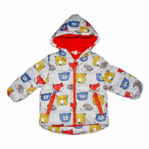 Jakna sa kapuljačom. Dva džepa i kopčanje rajsferšlusom napred. Rastegljivi rubovi na rukavima. Unutrašnjost jakne postavljena mekanim materijalom. Motiv divljih životinja celom površinom.