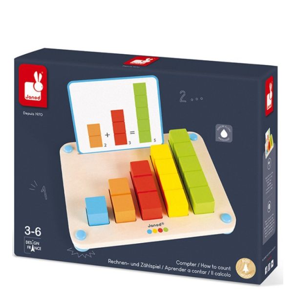 Hajde da vežbamo mozgiće! Ova drvena edukativna igra pomoći će vašem detetu da zavoli matematiku! Ova Janodova drvena brojalica sastoji se od 12 modela i 14 kockica u različitim bojama. Može da se uči na dva načina: Prvi je za male početnike – brojanje od pet, tako da se kockice stavljaju u odgovarajuće mesto na ploči. Drugi način je malo teži- sabiranje sa modela koji su prikazani na karticama.