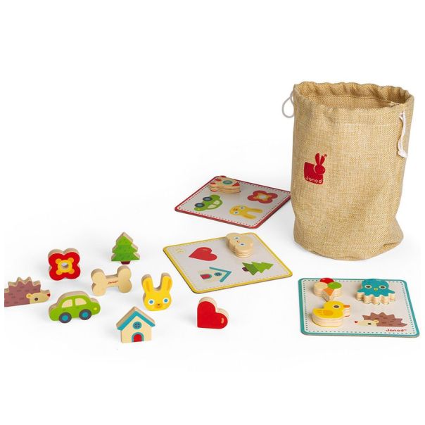 U platnenoj vrećici, naćićete 5 kartica za igru i 21 drveni oblik. Stavite ruku u vreću, i pokušajte da bez gledanja pronađete 4 predmeta sa vase kartice! Oslanjate se samo na svoje čulo dodira. A ako želite da igra bude teža, tu je koska – onaj igrač koji izvuče kosku, mora da vrati u vreću sve one oblike koje je već identifikovao. Idealna igra za razvoj čula dodira. Od 2 do 5 igrača.