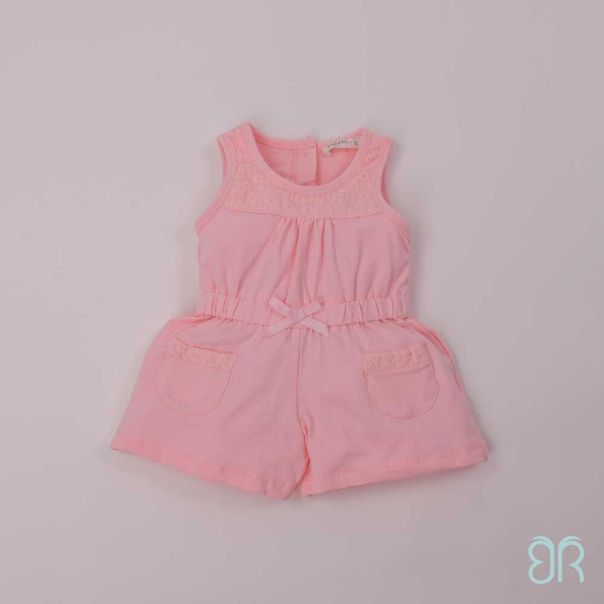 Kombinezon bez rukava sa elasticnim pojasem. Prisiveni dzepovi na prednjoj strani. Izvezen motiv cvetica. Kopcanje dugmicima na ledjima.